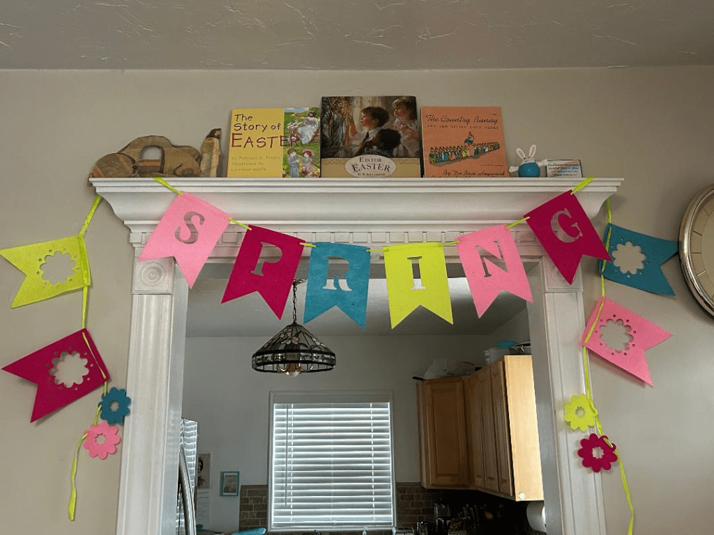 If you want an easy way to decorate for Easter, here’s my favorite tip: use Easter picture and chapter books! You can put them on top of a bookcase, as shown above, on a coffee table, in stacks, with the spines facing the direction where they are most likely to be observed. If you are as blessed as I am, you can use the ledges above your windows and doorways. Mine are wide with grooves so it’s like they were meant to hold books! See below. Most of these books I have found at thrift stores in the past few years. I’m having sooo much fun switching out my seasonal and holiday books ever since I discovered this trick last summer, for Independence Day.