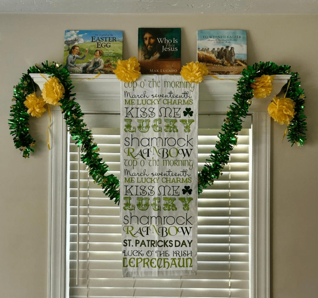 I only have one St. Patty’s picture book which I’m keeping in my Morning Basket right now, so I just mixed my Easter books with St. Patty’s decor. It’s all springtime, so it works!