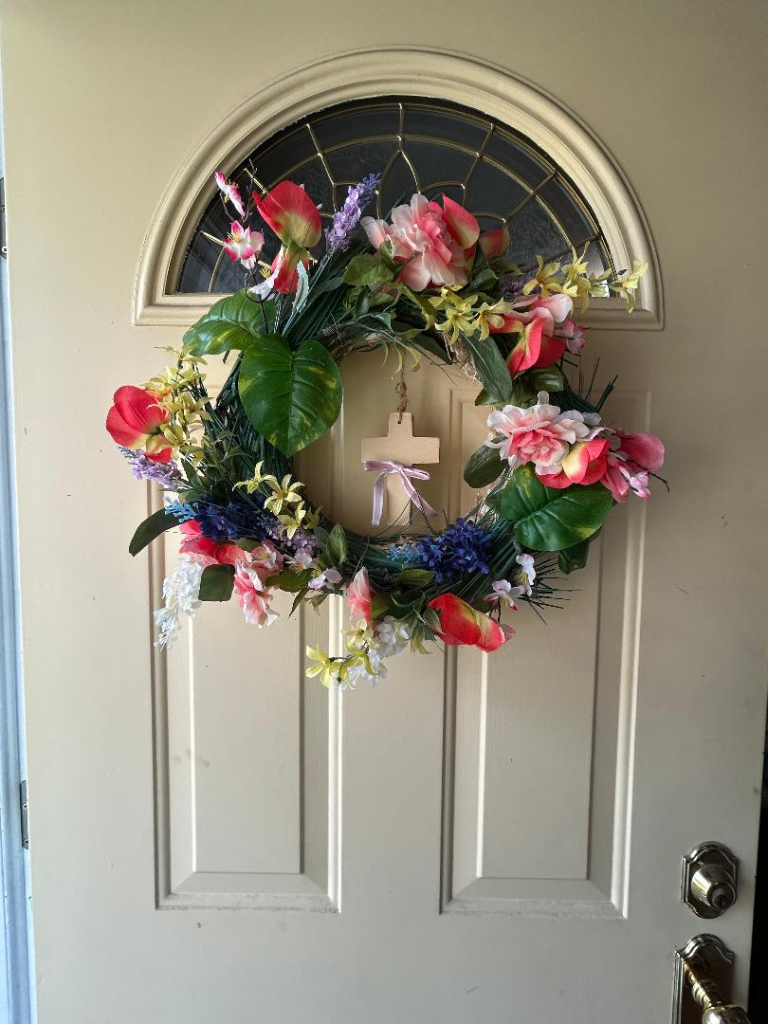I added in some St. Patrick’s decor in with the Easter. The shiny garland below came from Hobby Lobby. I found the cute St. Patty’s “sign,” which is actually a table runner, at the Provo D.I. last August, for only $3. It’s folded in half and held in place by the Max Lucado book, sitting on top of it. I’m even more excited about St. Patrick’s Day this year, as I recently discovered closer Irish roots than I have before. One of my sons moved to Ireland last summer with his wife. I found out just last week in FamilySearch that my 8th great grandfather, Thomas Matthews, was born in the same town where my son and his wife live now! Yes, I can say, “Kiss me, I’m Irish!” I dream of traveling to visit them in the next few years.