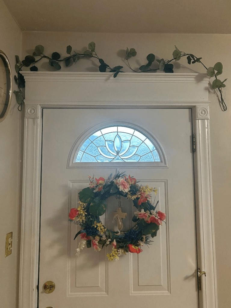 If you want an easy way to decorate for Easter, here’s my favorite tip: use Easter picture and chapter books! You can put them on top of a bookcase, as shown above, on a coffee table, in stacks, with the spines facing the direction where they are most likely to be observed. If you are as blessed as I am, you can use the ledges above your windows and doorways. Mine are wide with grooves so it’s like they were meant to hold books! See below. Most of these books I have found at thrift stores in the past few years, for $1 to $2 each. I’m having sooo much fun switching out my seasonal and holiday books ever since I discovered this trick last summer, for Independence Day.