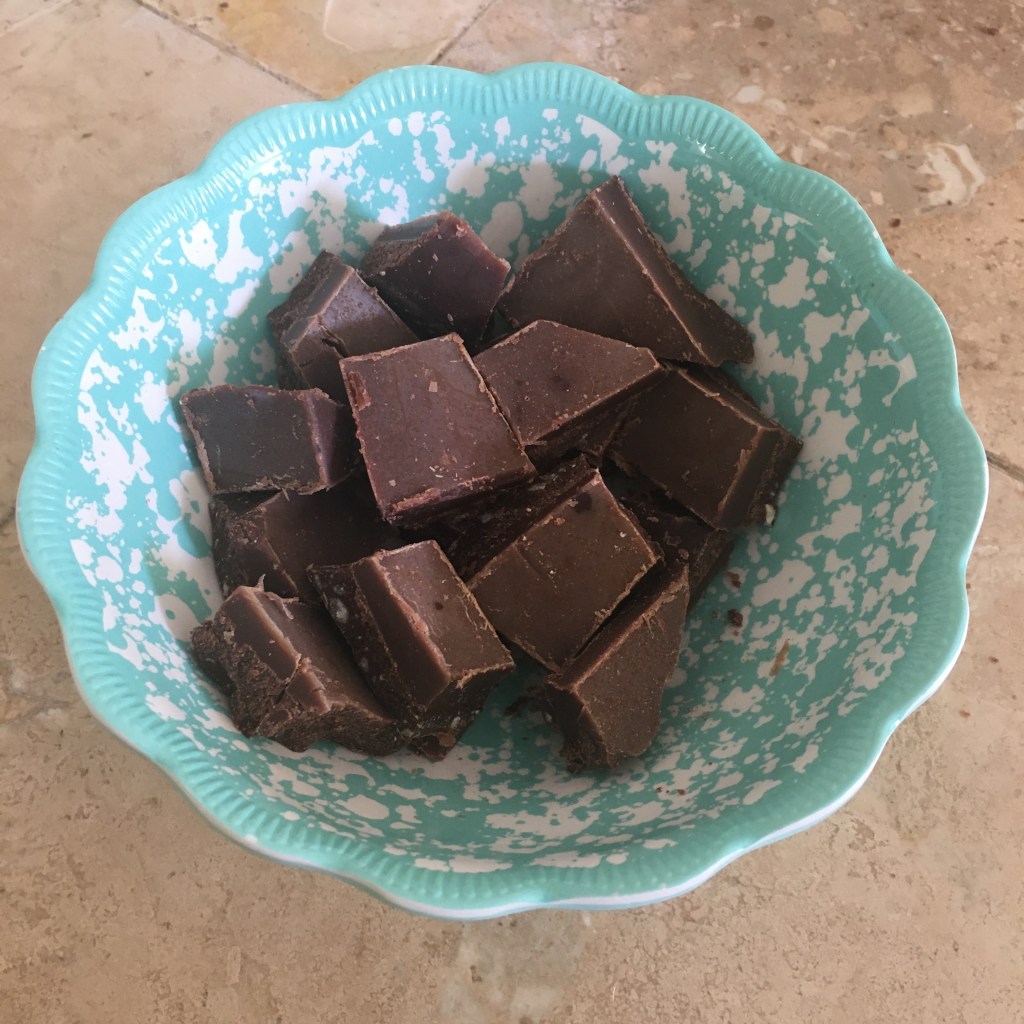 Mix all the dry ingredients together in a parchment paper-lined loaf pan. Taste this brown powdery substance. Add more salt or more sweetener to adjust taste to your likeness. Once it is perfect, add the melted oil (already blended with the honey if honey is your sweetener of choice) and mix until thoroughly blended. Add essential oils or vanilla extract if you want. I have tried peppermint and orange oils and loved them. The Trim Healthy Mama Natural Burst Caramel Extract Flavor was super yummy as well. Freeze for a few hours. Than pop out of molds or cut into rustic chunks and store in a glass jar if your house isn’t too warm. If it’s warm, above 72 degrees F, store in the fridge.