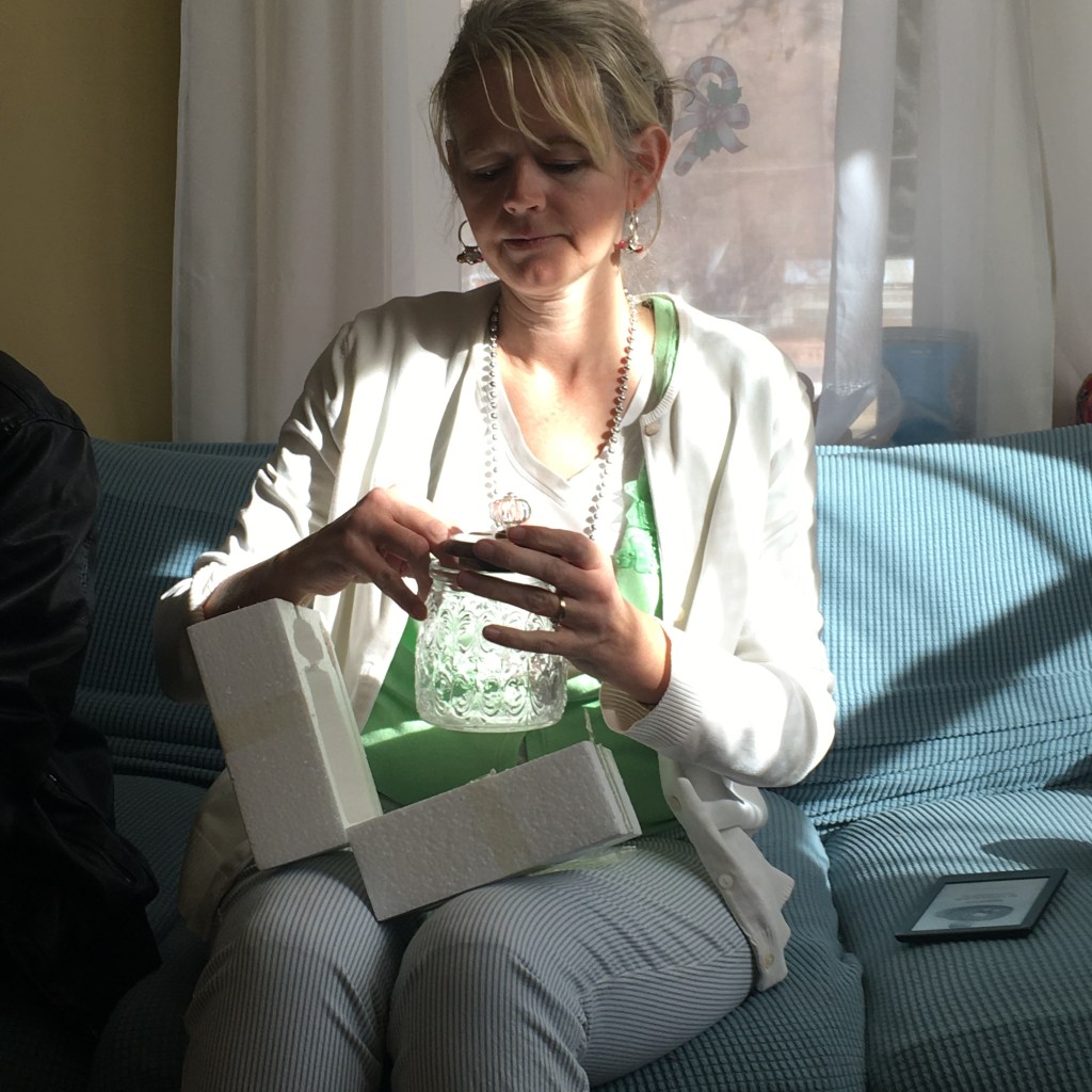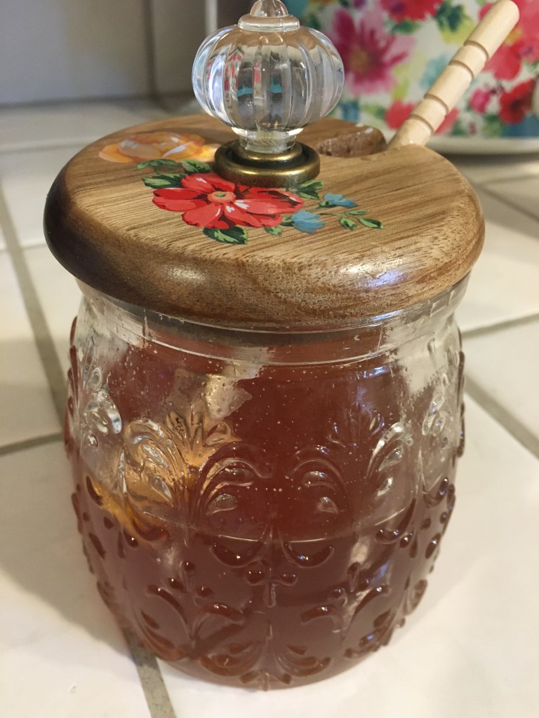 One of my boys gave me the Pioneer Woman honey pot with a cute note relating it to Winnie-the-Pooh, hearkening back to his childhood days of hearing the Pooh stories. Here I am, above, carefully opening it, not wanting to break it. I wish I had smiled for the camera but I was so focused on checking it out without breaking it. It’s the most elegant honeypot I’ve ever owned! See the photo below to see how pretty it is. I loooove it!