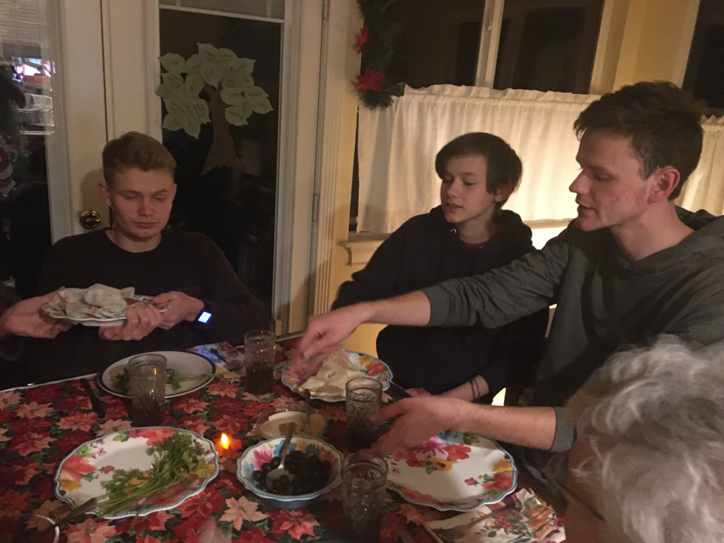 Christmas Day we had our Bethlehem Supper by candlelight. Fish, flatbread, hummus, bitter herbs, olives, dates, and cheese. Those are all foods Jesus perhaps ate in the Holy Land. Well, maybe not the hummus. We also always have rice, even though that’s not Middle Eastern food. We eat it because years ago our next-door neighbor was from Ghana. He had a mother from Syria, which is close to Israel. She taught him how to make this rice dish. He invited us over often for dinner and always fixed his specialty, a “secret” rice dish, with cinnamon, chicken broth, and pasta. So to add more bulk to the meal we fix it, even though it’s not authentic. :-). Topping the pita bread with hummus, then fish and rice is super delicious. I abstained from the bread and rice to keep low carb.
