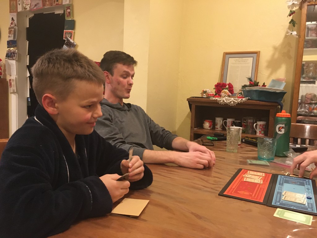 The nest morning, New Year’s Day, we continued the games since we hadn’t gone through everybody’s choices the night before. I had to deliberately make an appointment at 9 AM with my firstborn to play the above game. It’s Wingspan, and it’s all about birds. He had other stuff going on later, including a date, and rock-climbing. This was a present he requested and I happily obliged as it looked beautiful and fun when I saw it online. Bugsy, the 11 year old, played it with us.