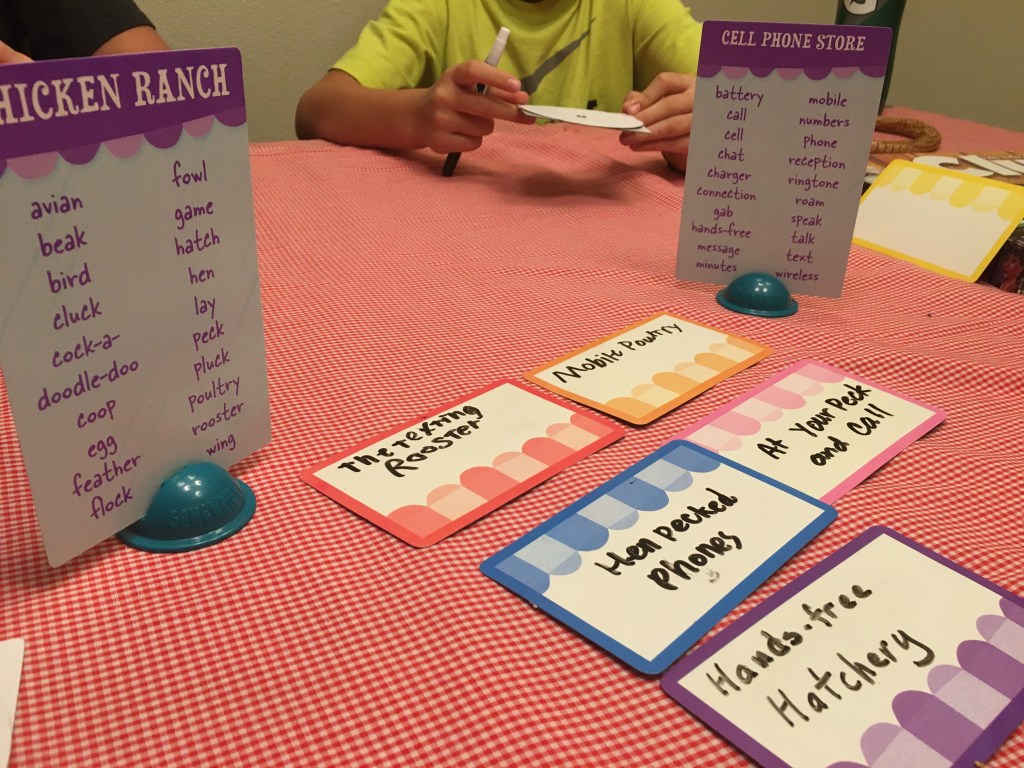 I got this one thrifting. Great game for stimulating creating thinking. It’s like Apples to Apples. The judge picks up a prompt of a business that combines two things, like “chicken ranch” and “cell phone store,” as shown below. Then the players write down a name for that business and the judge picks his/her favorite. I thought “At Your Peck and Call” was the best name for a chicken ranch + cell phone store.