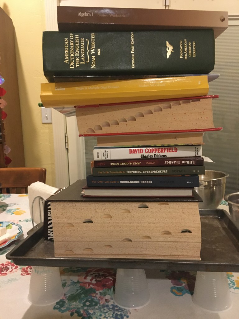 I thought this lesson was particularly powerful, to learn about about what makes a strong foundation for a church. One cup didn’t hold up more than one book, but with five other cups and a platform (an old cookie sheet) to distribute the weight, it was amazing to see how many books the cups could hold! Three thick dictionaries plus more! We had fun seeing how many books we could pile on, then we talked about what each cup could represent in foundation of the restored gospel of Jesus Christ, including Jesus Christ, the Book of Mormon, and priesthood power.