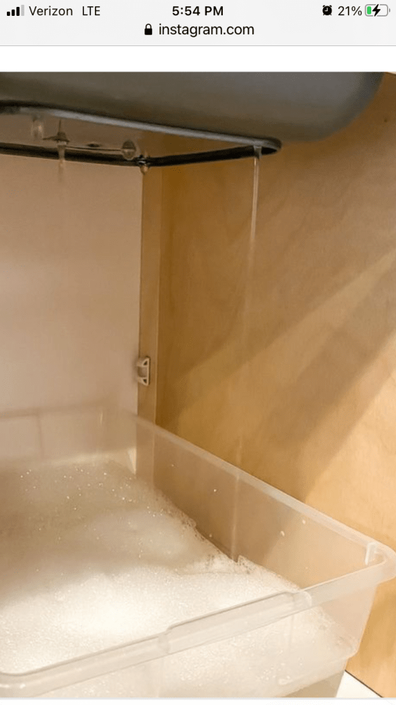 “Under the sink basin there is a shoe box sized plastic bin to catch the drainage. This is a 99 cent Sterilite bin from Target.