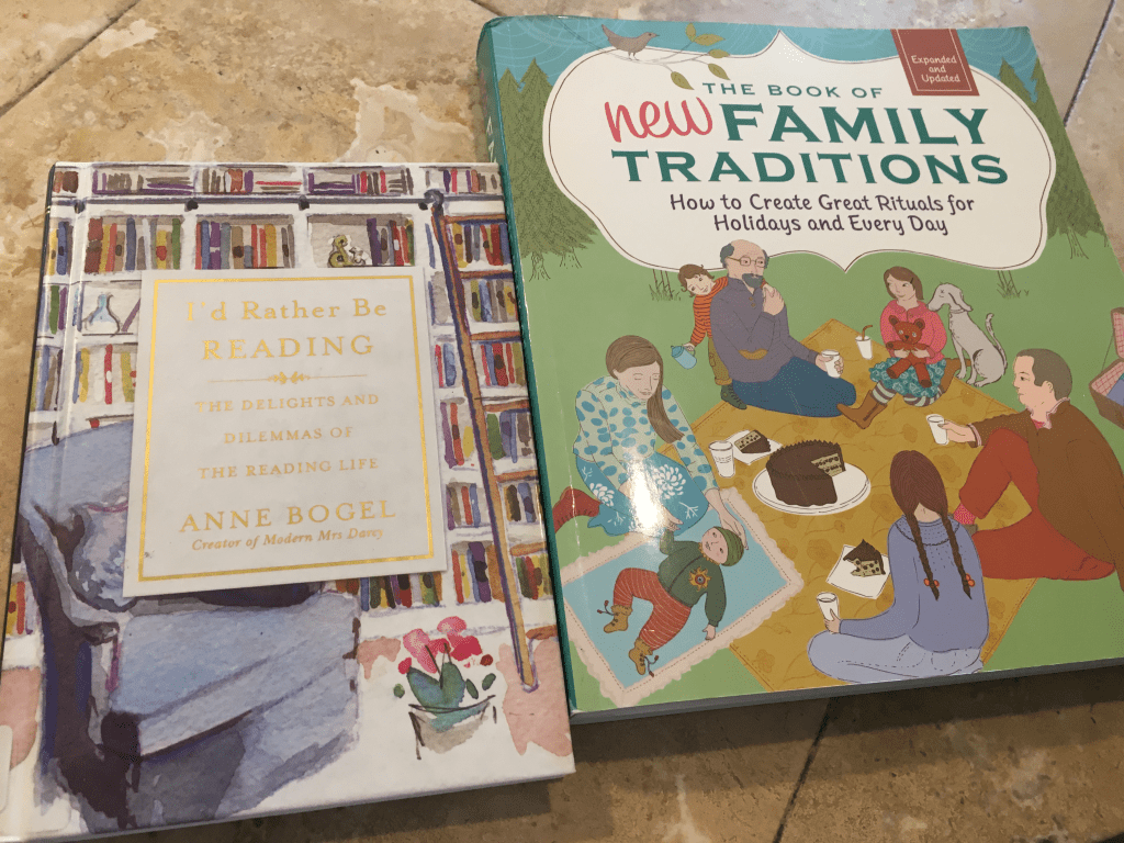 I felt God was reaching out to me with these little boxes of books on a stand. He knows how much I love books. He knows how much to delight me by providing me with not one, but two boxes of books to use within short walking distance of my home. Each box had a book I knew God wanted me to read. They each popped out to me begging me, “Read me, read me!” One is about family traditions from author Meg Cox and one is from a blogger and podcaster I enjoy! (Anne Bogel from Modern Mrs. Darcy/What Should I Read Next) God knows me so well and He knows how to thrill me!