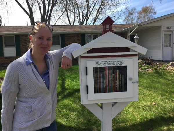 Then on my recent neighborhood walks I have discovered two Little Free Libraries. They are so cute! A Little Free Library is a box of books to share with anybody. You take a book home and replace it with a book to donate to the box. The above picture shows a picture book that tells the story of how they got started by founder Todd Bol. The picture below shows the author with a real Little Free Library.