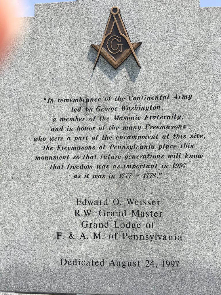As I’ve driven the car to do my errands and road trips to meet up with my daughter and my two grandbabies, while they have been visiting from out of state, I’ve listened to the following book on CD by Timothy Ballard. I’m almost done! It’s so fascinating. It helps explain why, when I went to Valley Forge two years ago, the monument to George Washington there had Masonic symbols on it. See the pictures below the book cover image.