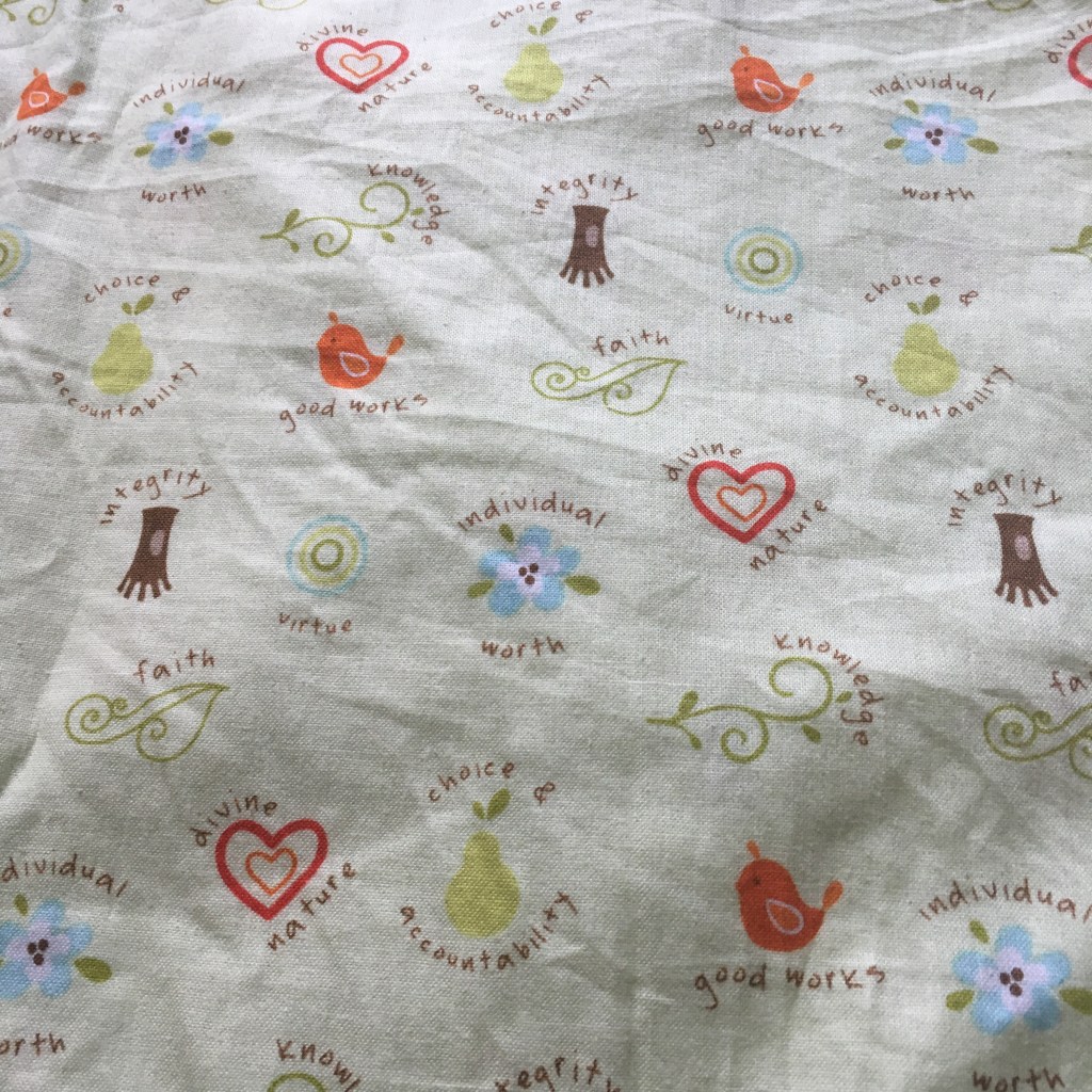 I found this cute pillowcase below. I didn’t bother ironing it, but you can imagine it would look even better without the wrinkles, LOL. It features the seven values from the Young Women program of my late teen years from the Church of Jesus Christ of Latter-day Saints. I’ve been wanting something to decorate the top of my piano to brighten up a drab green runner already on the piano that was a gift to me. This fits the bill perfectly!