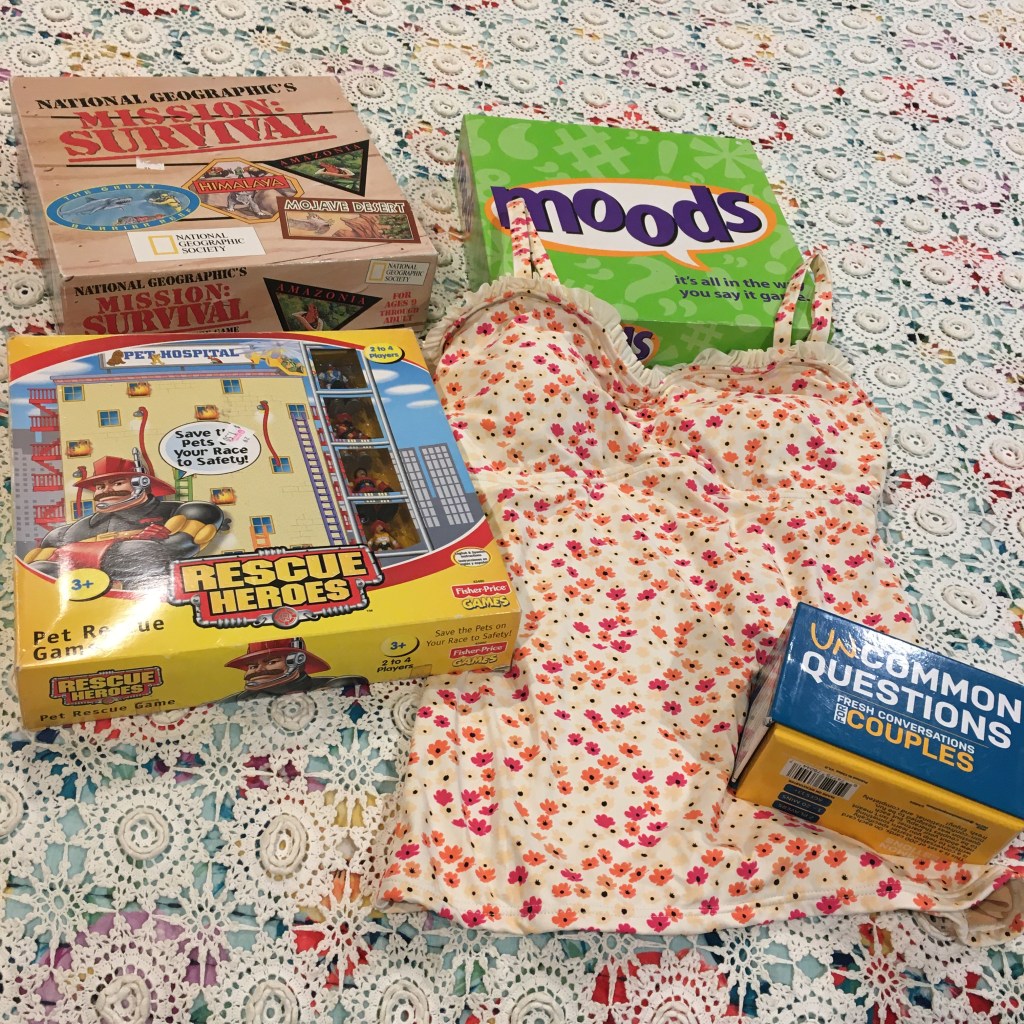 The greatest find was the Moods board games above and below. See here for my full story about that, including why I got two copies (actually three!) with God’s hand in the discovery. The conversation cards are to do one a night with my husband, and the top is a swimsuit top to go with my black swim shorts. So pretty!