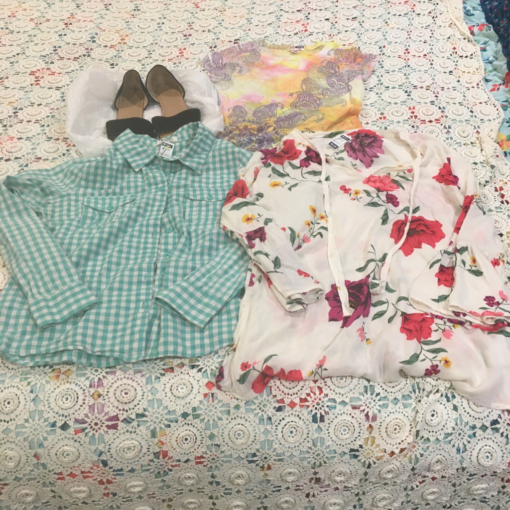 I wanted some new summery tops and found these, above and below. I love the tiny strawberries, and the multi-colored stripes. So cute! Plus I found some dressy black flats perfect for summer, as shown below, to go with my black skirt. The butterfly print top in the picture below, in the top right, was only $2! The sea foam blue gingham has sleeves I can roll up and keep up with buttoned tabs, for warm weather. Then when it gets cooler I can roll them down. The floral top I can dress up with a skirt or wear with pants.