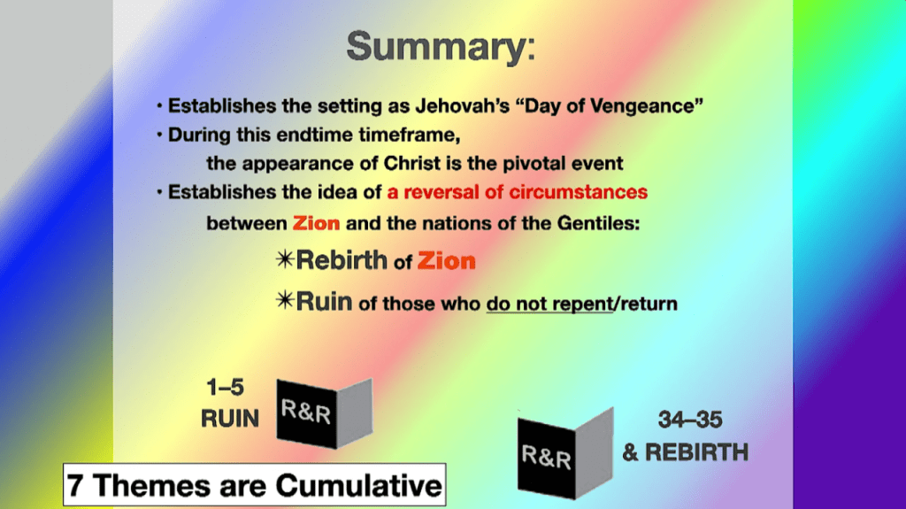 You can download a colorful handout of the Bifid structure here (click on “can I download the handout from the Isaiah workshop?”) Thanks to Rhonda and Farrell for all these great resources, and for the pioneering work of the supreme Isaiah scholar, Avraham Gileadi, the Pickerings’ mentor.
