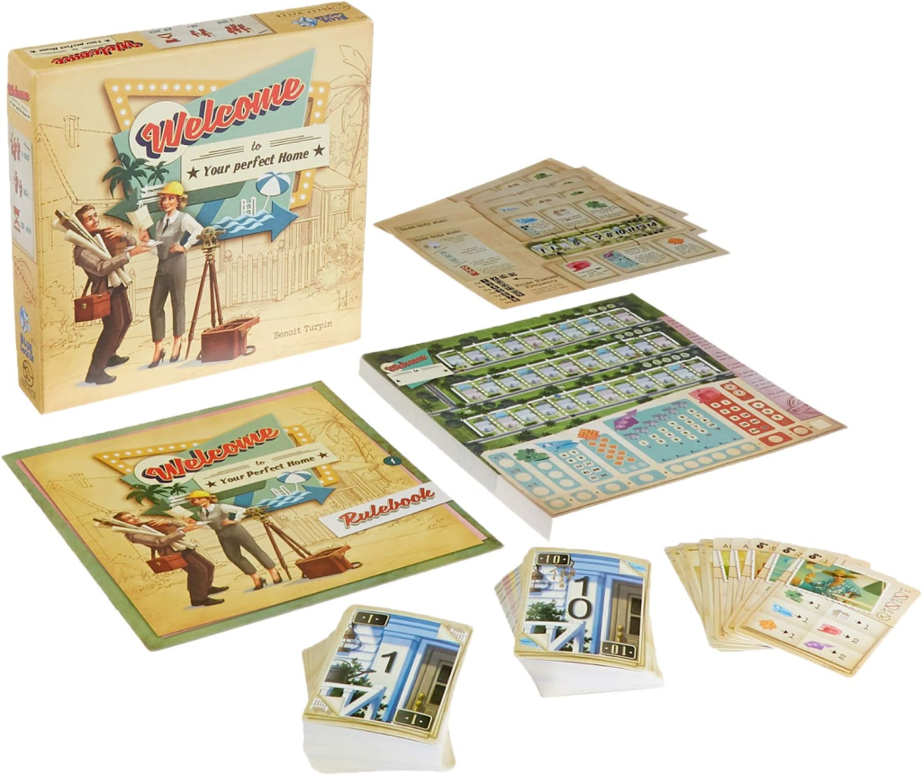 This is my new favorite game. It’s called Welcome To. We borrowed a copy of it from the public library. (Yes, my library has games, how sweet it is! It’s like they thought of me!) I love playing it so much, now I am going to get our own copy. In this game, you get to be a subdivision developer. You win by getting the most points, which comes from building parks, building homes with pools, building groups of homes (estates) with fences around them, and planning the order of the house numbers wisely. It’s like Quixx with a purpose. See my winning paper game below, where I scored 102 points! I like Quixx OK but this one is so much more fun. It has the “press your luck aspect” of Quixx with putting numbers in a sequence has but more variety and meaning.