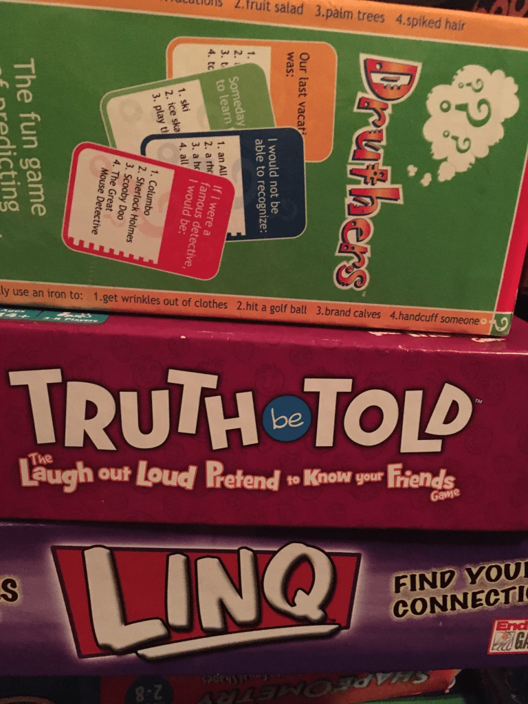 We had my sis-in-law, her husband and her son over for game night. While my son and his cousin played Catan, the adults played the games above and below. Fun, fun, fun! I just love all of these. It’s just so interesting to see if you can figure out what other people are thinking, in Druthers and Truth Be Told. You can read about Druthers here. Then Linq is a fun word association game. You have to have at least 4 people to play. It’s kind of like Chameleon, but with just a pair of words, the “link” hence the name, Linq. Why people have to reinvent the spelling of words to get a game to sell, I don’t know.