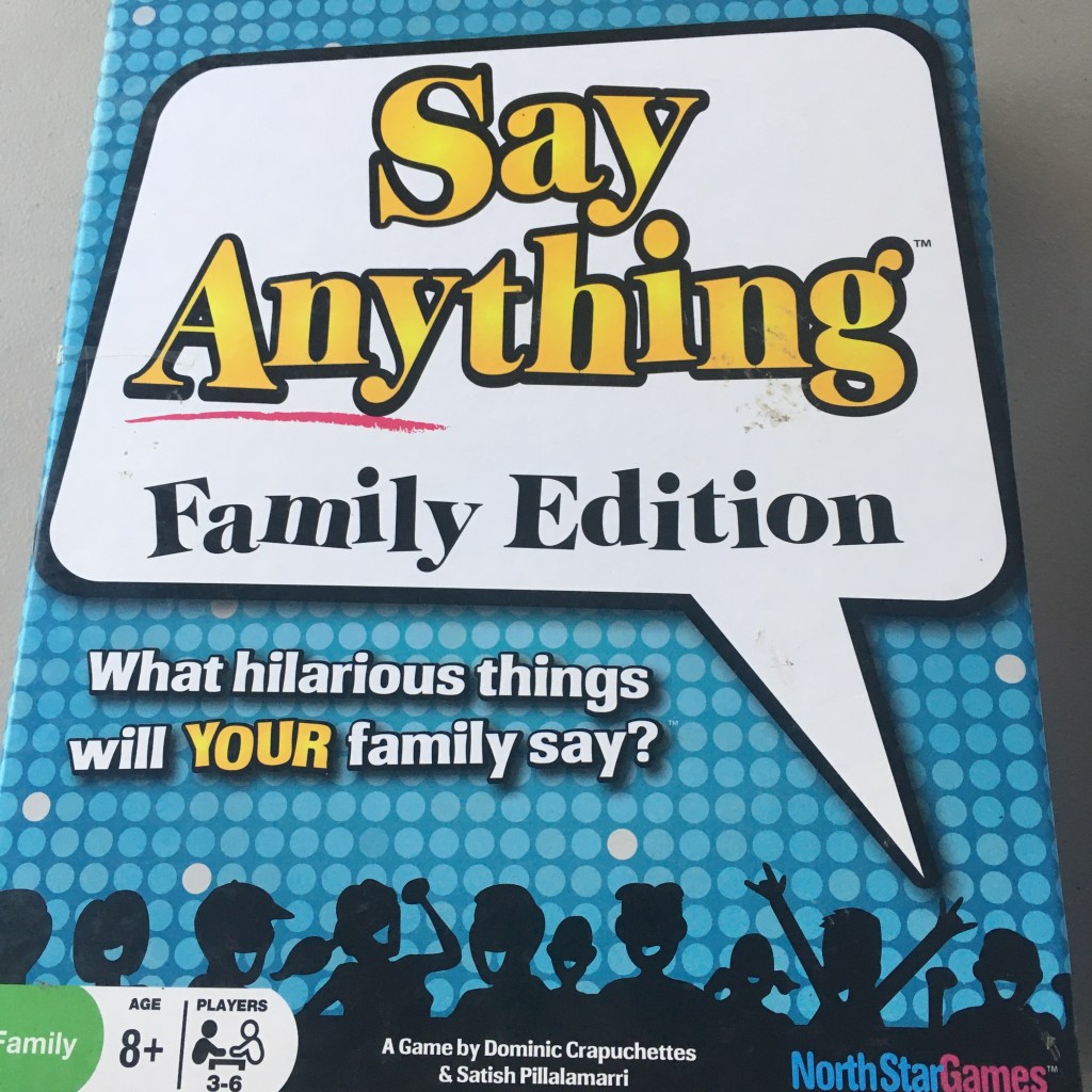 Say Anything is a great getting to know you game. It’s best played with people you already know. Players take turn being the judge and reading a question. Then the other players supply the answers. The judge votes on his or her favorite answer. Then everyone else has to guess what the judge picked. It calls for creative thinking. I love it.