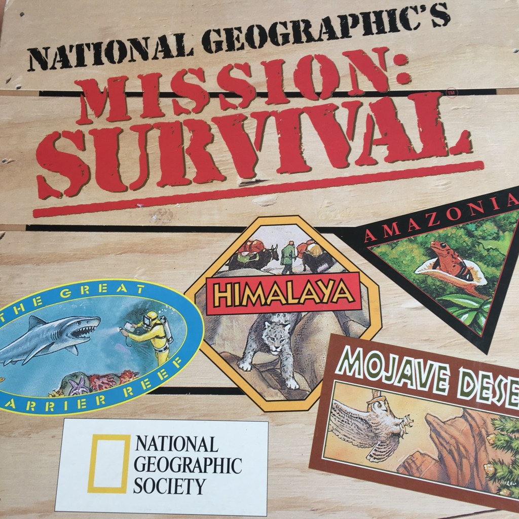 Last but not least is this game published in the early 80s I picked up while thrifting. It’s nothing to rave about. Just a typical roll and move trivia game, involving questions about geography, animals, and survival skills. I just may ditch the board and put the cards on my dining room shelf for going over with my kiddos while we eat. I have a bunch of collection of cards now that we rotate through during mealtime. Occasionally we play an actual tabletop game during mealtime, which you can read about here.