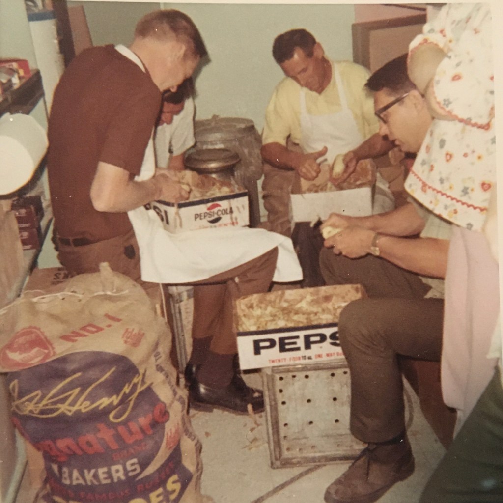 I’ve been helping my mom, who has lived in the same home with my dad for over 40 years, dejunk. One week we worked on their amazing vinyl record collection. Then another week it was photos. The one above features my father and uncles having a potato peeling contest. I suppose it was Thanksgiving? I think that’s my grandma in the flowered blouse on the right, supervising. How fun it is to discover photos from decades ago of people I love!