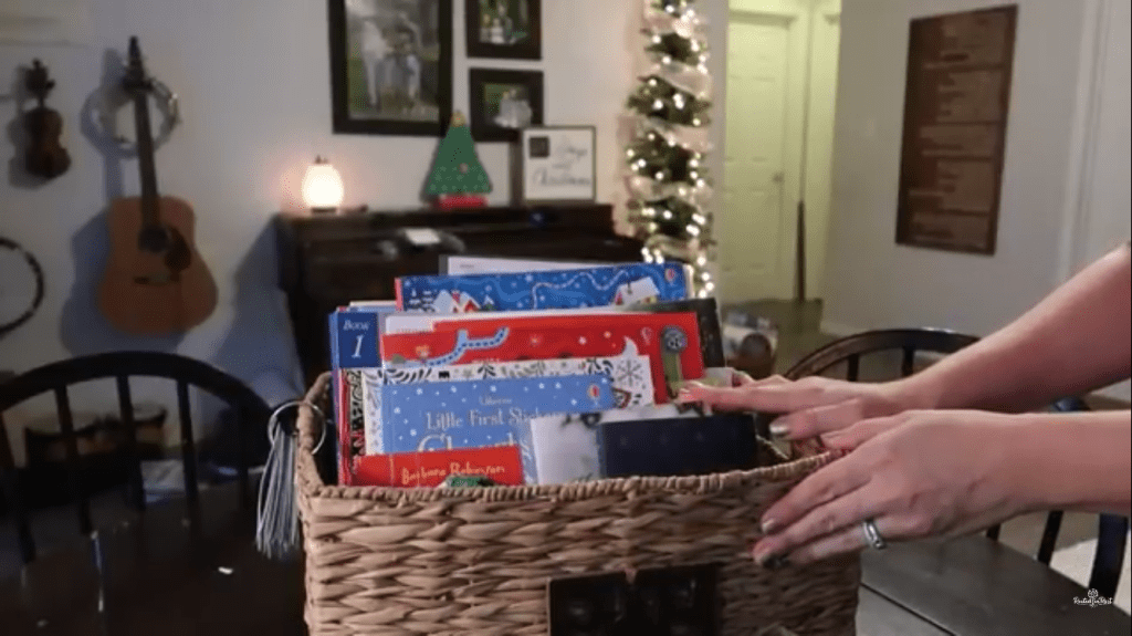 I love the idea of the “morning basket” for homeschooling. If you don’t know what that means, go here. It’s basically morning gathering time where you share things you are excited about with your children. For me, that means read aloud time! You can get lots of ideas from Pam Barnhill’s website that I just linked, plus her podcast about it. The above photo is not of my pretty Christmas morning basket, but that of Abby Stone from Rooted in Rest. It’s a screenshot of her video down below. I don’t even have a basket and you don’t need one either to do Morning Basket time.