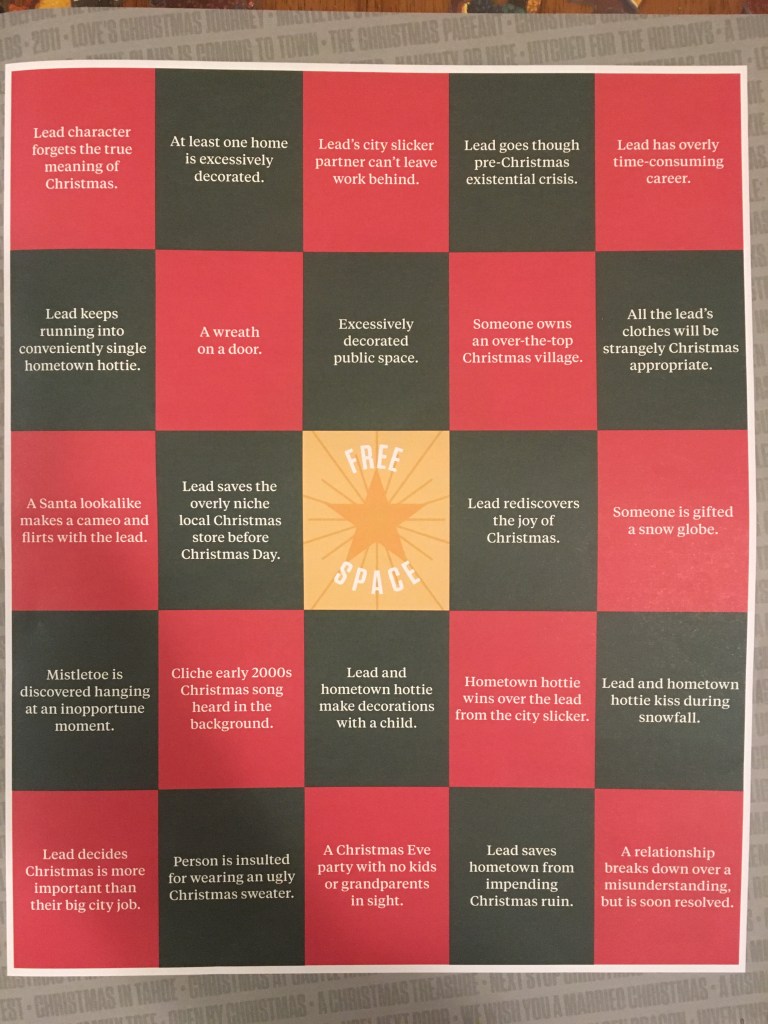 In the meantime, I’m having fun indulging in the cheesiness of these movies and using the above image to play bingo, even if it’s all mentally as I don’t really have time to sit down and watch the movies with hands solely playing bingo. At this point, so close to Christmas, it’s multitasking all the way (meaning I’m listening to movies as I wrap gifts or do other chores).