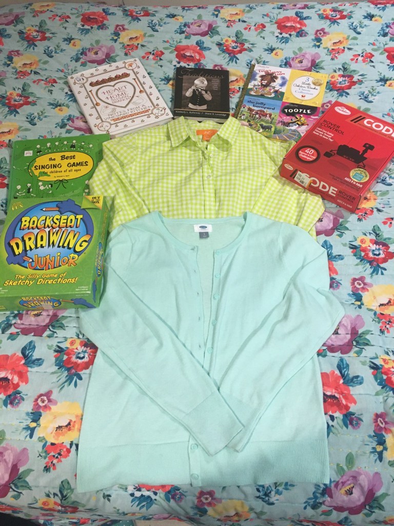 Then the GeoCards and Malarky cards are fun to use during mealtime. I saw the Malarky game at one thrift store. After looking it over, I thought, I don’t want the game, I just want the cards. So I didn’t buy it. Then an hour later, at a different thrift store, I found just the cards, so I bought them for $1. Perfect! Elementals is a chemistry-themed card game. The Fun Bible Facts I keep in the living room and occasionally toss out after our family scripture study or before or after nightly family prayer. Loaded Questions is a fun “getting to know you” board game, which I always love, and the World History Notebook again tickles my love of history and trivia. Plus a cozy teal blue cardigan sweater!