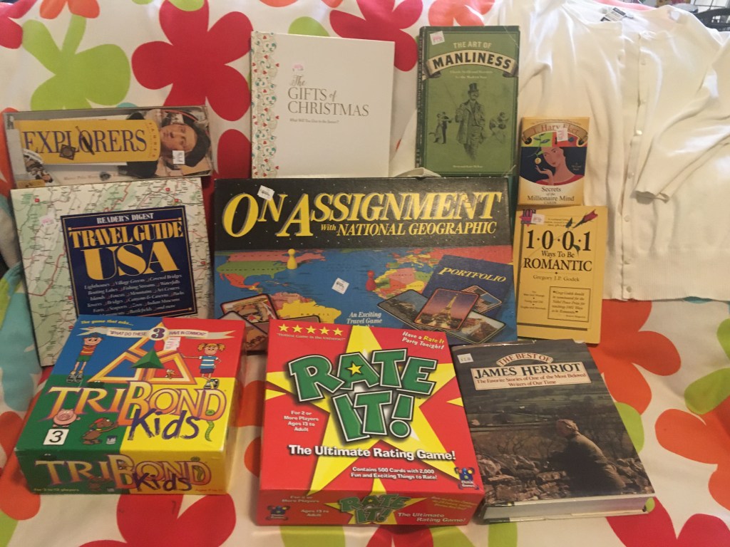 I just love the three sweaters I found above. Polka dots and stripes! Plus I found some games for the 6-7 year old class I taught for the past school year, another book about family traditions, and a People’s Almanac. It’s kind of hard to see but it’s in the far right. Here’s a description of it over at wikipedia. I’m nerdy that way in gathering trivia, so this book is right up my alley. I also totally scored with the Feelings Buried Alive and another trivia-filled book of lists.