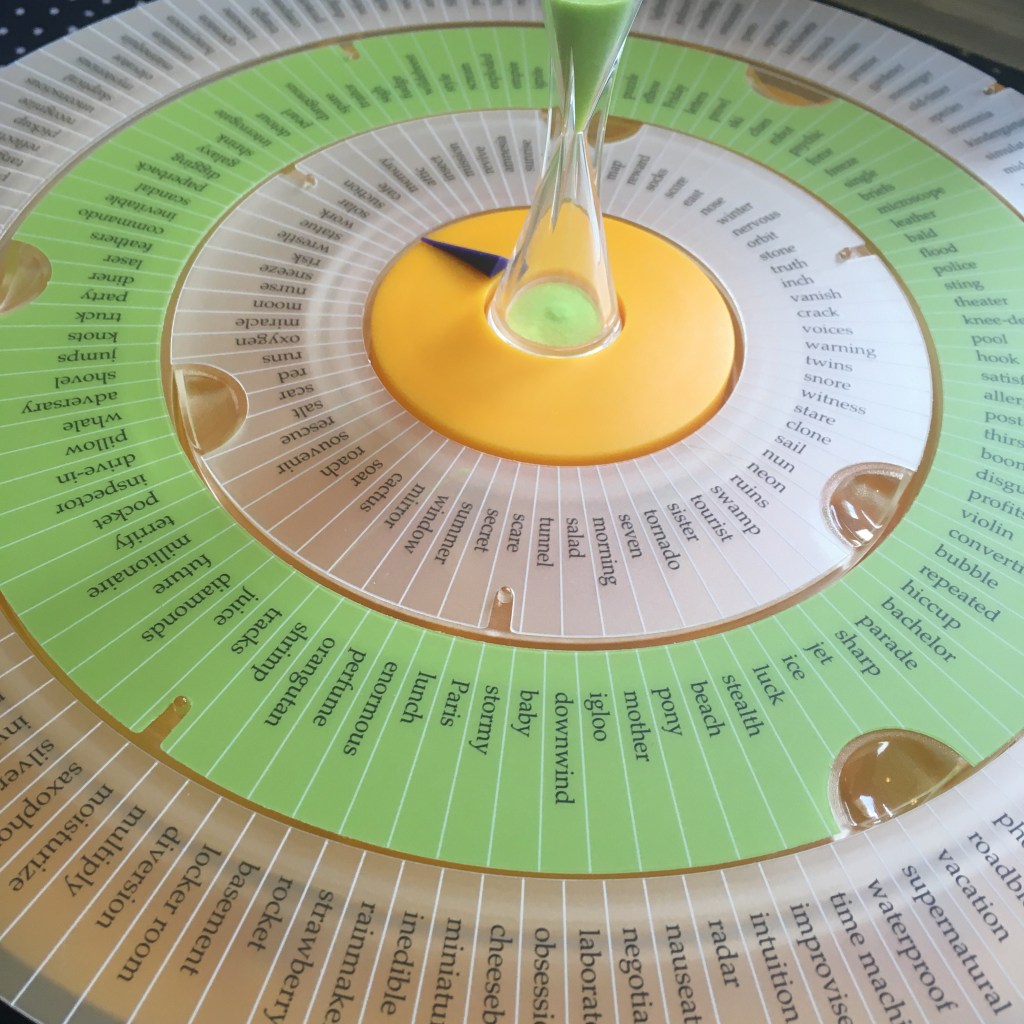 I’m always on the lookout for unusual tabletop games. This one below, called Spinergy, is a fun one to stir creative writing juices. Even though it rates at 5.7 on BGG, Tom Vasel approves it here so I snagged it. We played it today for gameschooling. I can see it would be really fun with a group of people who love to write. Tom says it’s one of the best underrated party games. In the game, you see who can be the best author after being given three random words (generated by the spinner shown below) and a random scenario, printed on a card.