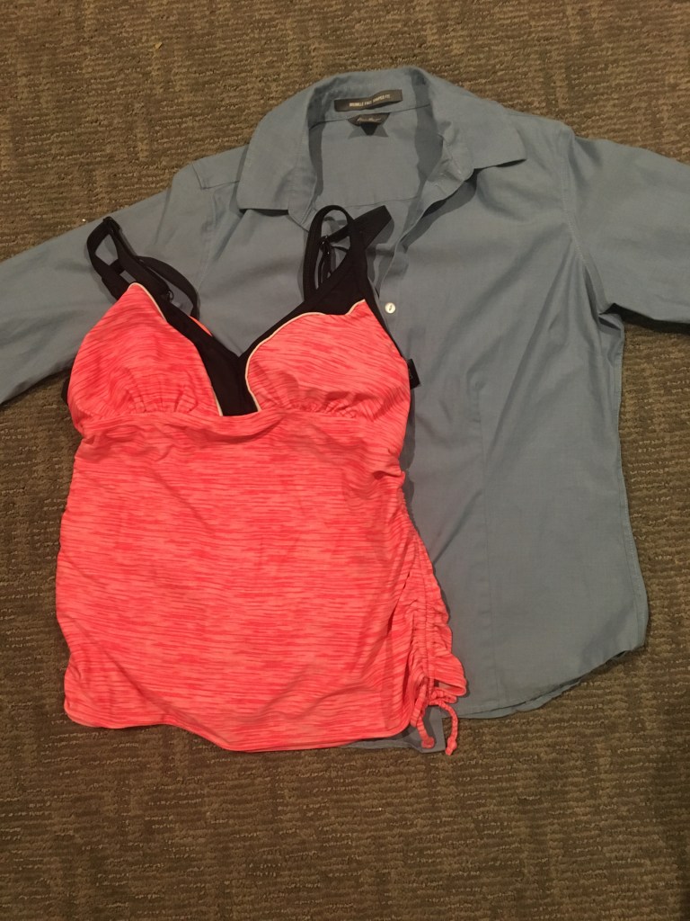 So, we went on a last-ditch shopping effort to Target and Walmart, the day before packing day. In between the two stores, I felt a whisper of the Holy Ghost suggesting we go to Savers, which is pretty close to Target. Because it was so close, and I am a sucker for thrifting, I decided to go. I sent my daughter to look at tops after we looked at the sandals, while I went to look at the board games. (Because, if I am at a thrift store, I have to look at board games.) She came and found me and said she couldn’t find anything. I felt another stirring from the Holy Ghost telling me to look harder, and to go down a particular row. After looking at four or five tops, there it was. The perfect top for her! It fit all the requirements! It was truly a miracle! See the blue top in the photo above. It fit so much better than the one from Amazon. It fits her small frame perfectly and is feminine as it tapers into the waist without being too girly. Plus, it’s high quality, with the brand name L.L. Bean. Its crowing virtue? It was only $2.99! This was definitely a blessing straight from God! It was if I heard Him saying to my heart, “Dearest daughter of mine, I know how overworked and underpaid you are, juggling all these demands and projects as you strive to serve me by serving your husband, children, church, and community, all the while you are wanting to stay healthy and sane with a modicum of beauty and fashion. Let me just bless you with this item. I am happy to do this for you! Here you go!” Thank you, Heavenly Father!