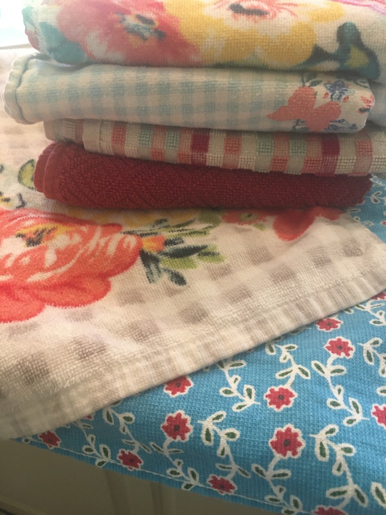 They are inexpensive and can be oh so cute! I’m talking about both kitchen hand towels (the fluffier the better) and dish towels with the flatter weave. They dress up your kitchen and brighten any day.