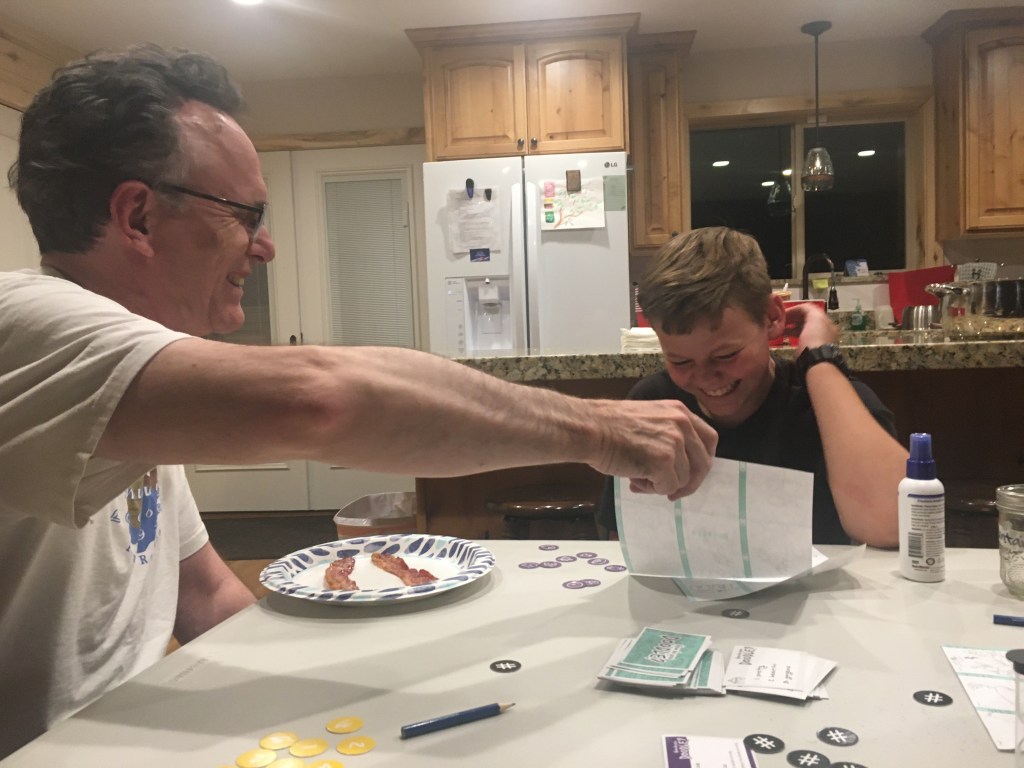 – playing board games as a family (with just the two kiddos left at home at a cabin in the mountains (which I also love). See games below.