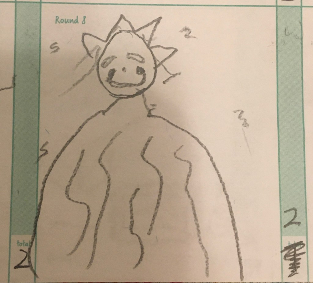 I really lucked out finding the game How Do You Doodle? the week before when thrifting. It made us all laugh hard several times. How funny it was to look at my husband’s attempt to draw “beauty.” See below. He was attempting to draw a beauty pageant winner to denote beauty, but she looks more like a sad-trying-to-be-happy, deteriorating, ill-proportioned Statue of Liberty.