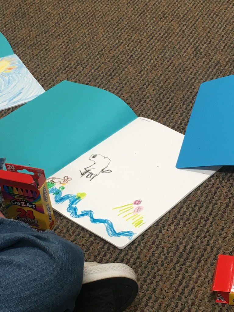 But a plus for the day was that, for the first time, I left the afternoon class of 6-7 year olds that I mentor with Katie Hansen of houseofthebook.org, feeling refreshed instead of feeling like I’d been wrestling with pigs, which every week had felt like that, until yesterday. The difference was her magical storytelling plus she let them draw the story in new notebooks she gave them, AND they each got their own package of crayons.