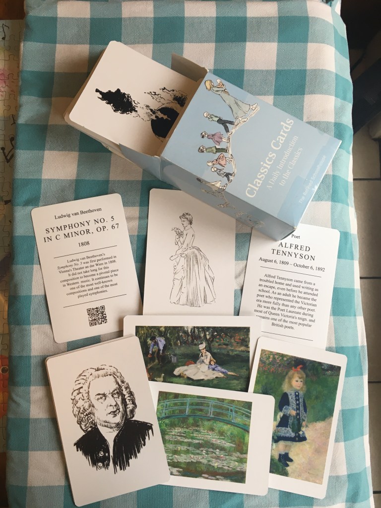 The idea is to do one card a day and the poem of the day from the poetry book at dinner time. Then we do some trivia questions and a getting-to-know-you question or two. One side of a Classics Card features the artwork or the image of something to do with the classical work or the creator of the work. The other side has an excerpt from the poem, or bio info about the creator, or a description of the classical work, and often the date. Sometimes it has a QR code to scan so you can instantly listen to the classic if it’s music. Sometimes the images are in full color, but mostly they aren’t. The 4″ x 6″ cards are fairly thick and durable to stand up to lots of use from little hands.