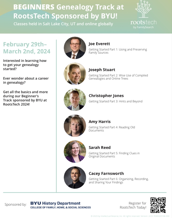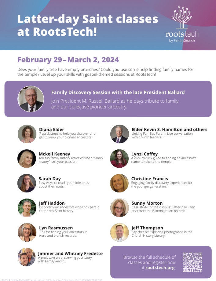 RootsTech, the world’s largest family history event, is almost here! I hope you join in some way, either virtual or in person. It all starts this coming Thursday, Leap Day, February 29, 2024. You can watch the virtual classes for free. In-person classes do have a cost, but it’s all worth it. It’s all so fun and enlightening! I love this annual event that combines technology with family history. I’ve never been in person, because of time constraints, but even just watching the classes online fills me up. I learn about new apps and websites to help in my family history research, I learn new research skills, and I get inspired to learn even more about my ancestors and collateral lines. The Family Discovery Day for members of The Church of Jesus Christ of Latter-day Saints, on Saturday, is always especially wonderful. With classes for beginners to experts, members of The Church or not, there is something for everyone! Just scan the QR codes you see on this screen if you want to register and enjoy learning about your roots!