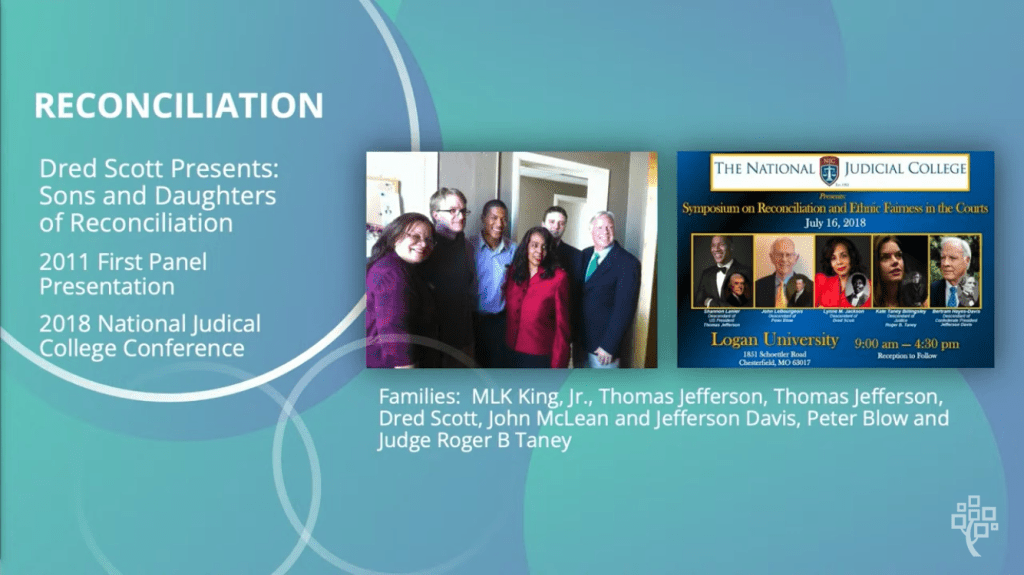 She shared that Dred Scott was born as Sam Blow and showed a photo of the record of that name in the family Bible. She said that the Blow family bought her ancestor with the intent of setting him free. She also shared a photo of a charcoal drawing of Dred and his wife Harriet. She also shared photos of reconciliation between a representative of the Roger Taney, Chief Justice of the Supreme Court of the aforementioned case, and her family. A currently living family relative of Justice Taney publicly apologized to her family for the Supreme Court’s decision. This presentation was amazing!