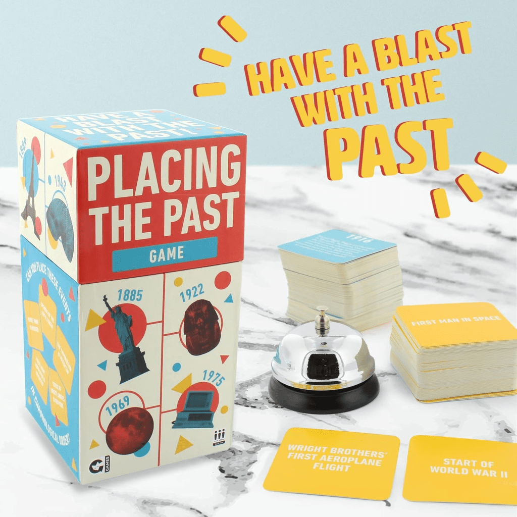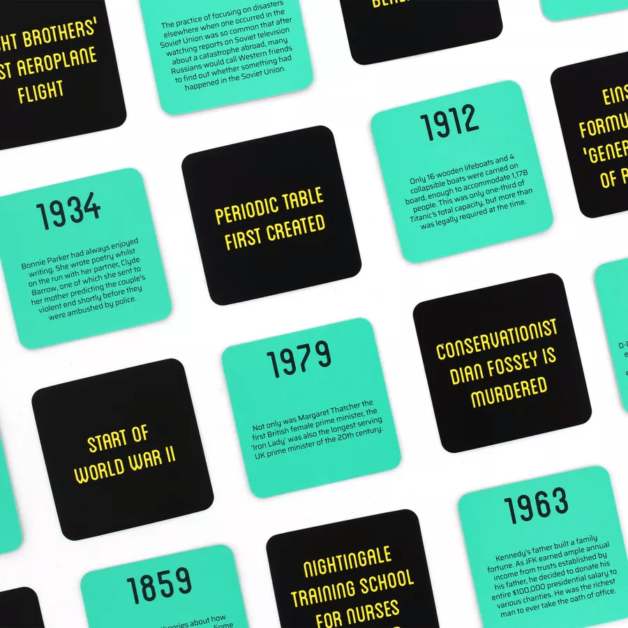 Each player takes a turn presenting his or her hand of the cards in chronological order to the other players. You can choose to omit two of the cards if you aren’t sure on those ones. The other players look at the order you made. If any player thinks you are wrong about your order, he or she can challenge you by ringing the bell. Then that person gets to rearrange the order. Then the cards are turned over and you all get to see who was right. If the original order was correct, the first player keeps the cars. If the correcting player was correct that player gets the cards. If no one was right, no one gets the cards. Each card represents a point. The player with the most points wins. (Note the color scheme in the photo above is outdated, the cards are now yellow on one side, blue on the other. Much better scheme I think.)