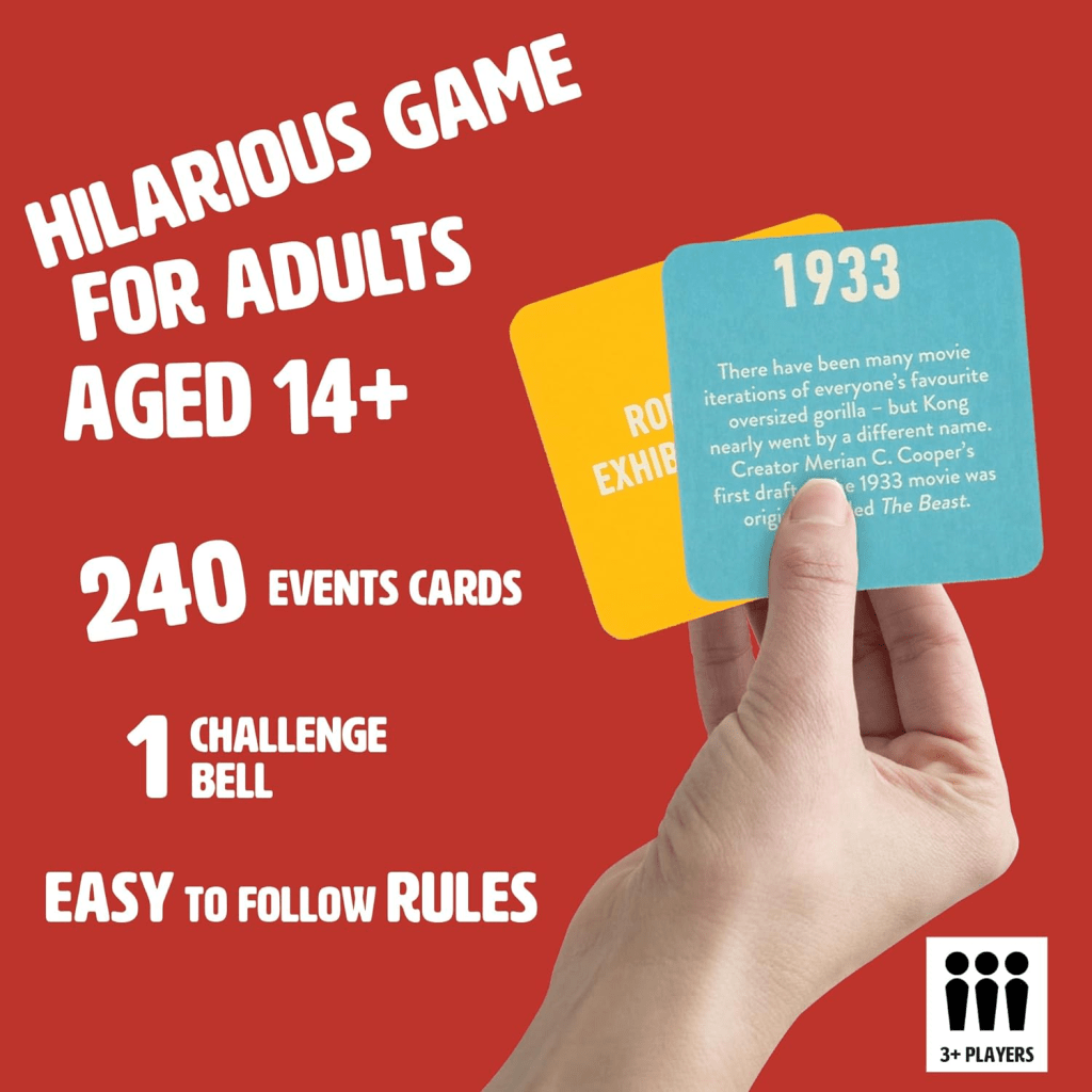 I just wish it had pictures. That would make it so much more fun. Because it involves a knowledge of world and U.S. history, it is for ages 14 and up, as most kiddos by age 14 have learned the basics of those topics. If you are playing with people younger than 14, who have less than a basic knowledge of history, you might want to ditch the “ring-the-bell-to-challenge” mechanism as it might be too discouraging. The description on amazon, and shown in the image above, says it’s “hilarious.” That’s an over-the-top claim. I can see it maybe being hilarious if you played with people who love history, who have a memory of dates, who love to be competitive, and you played with the bell, as then it’s a race to see who can spot the mistakes first and ring the bell. What would it make it super fun for me would be to play like the game Pictomania where everyone does their work at the same time (drawing a picture in the case of Pictomania, arranging a timeline in the case of this game). Then you look at the other timelines and race to ring the bell. I guess it could be a party game or an icebreaker game if you have the right crowd of people who enjoy intellectual challenges, especially with that modification I just suggested.