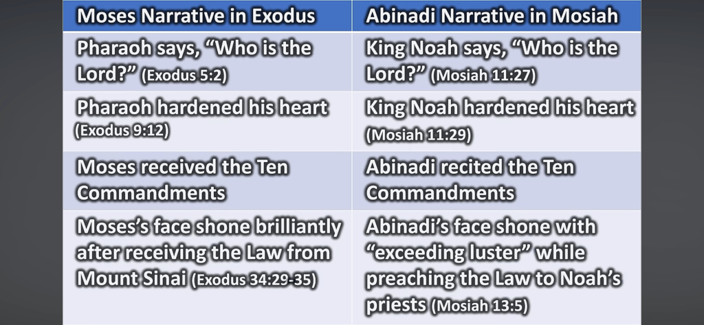 The parallels he shares between Moses and Abinadi and the Ten Commandments fascinate me. See chart below.