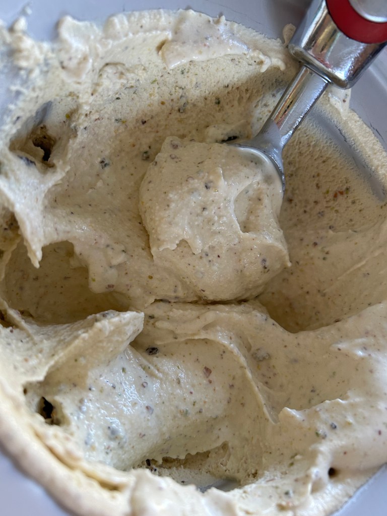 One of my adult sons picked pistachio ice cream recently when I asked him what flavor he wanted. It turned out super yummy. I confess I had a small portion even though I am usually keto. Next time I might make a keto version for me using allulose. This homemade version is not as pretty as store bought with the bright green color, but it tastes better and isn’t full of the artificial colors and flavors, not to mention antifreeze, which is in all commercial ice cream, according to Sarah Pope of the healthyhomeeconomist.com. Next time I make this maybe I’ll try adding a little bit of pureed spinach to make it green, like I learned how Serene and Pearl, of Trim Healthy Mama fame, do for their sugar-free key lime pie. I tried that with avocado too, for a Mint Chocolate Ice Cream, you can get the recipe here.