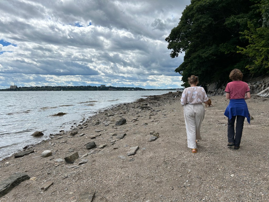 My daughter and sister walking along a beach in Maine.
