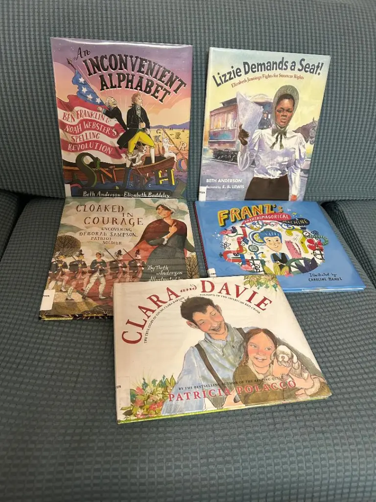 My favorite way to teach history to children, really to anyone, is to read aloud picture book biographies together. That’s because they teach history with a story and pictures. It’s really hard to latch onto history without an engaging story to put dates and names into context. That’s what picture book biographies do. You can learn so much from these, and the library has a lot! Just go to the 920s in the juvenile nonfiction section for picture book biographies, at least at my library. I love these so much I’ll share lots of images of them below, interspersed among my tips about library services that completes this post. (I have some recommendations here and here on my blog.) This is how I started teaching history to my oldest back in fall of 1998, when I bought the set of D’Aulaire picture books biographies shown above, from Beautiful Feet Books. Those books and Mathusee were the first things I bought, along with the Charlotte Mason Companion book by Karen Andreola. You can probably find those, and all the picture book biographies shown below at your local public library.
