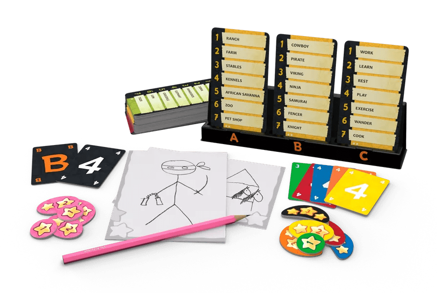 Pictomania is Pictionary on steroids where everyone plays every round as a drawer AND a guesser! Everybody has their own secret word to draw. It’s a race to draw your word as fast as you can and then guess the other people’s words. Sooo much fun! This is absolutely one of my favorite games! It is a lot of fun when you get a mind meld and can tell what people are communicating on paper, as well as get people to get right what you drew. Similar to the feelings in Just One, and Concept.