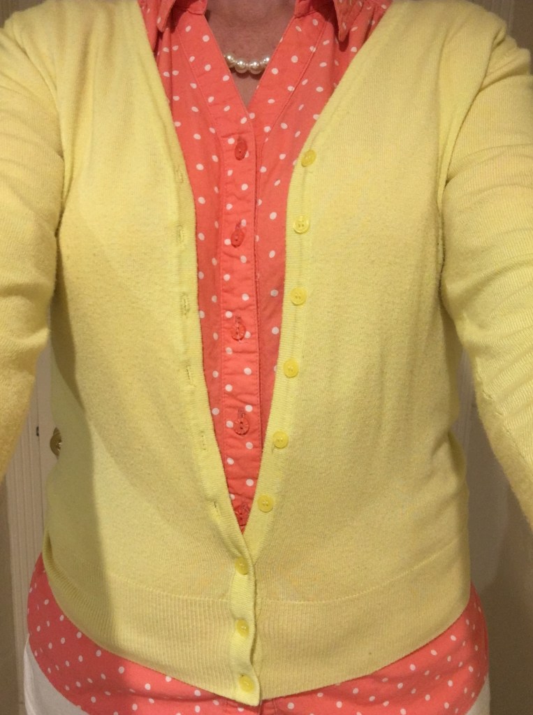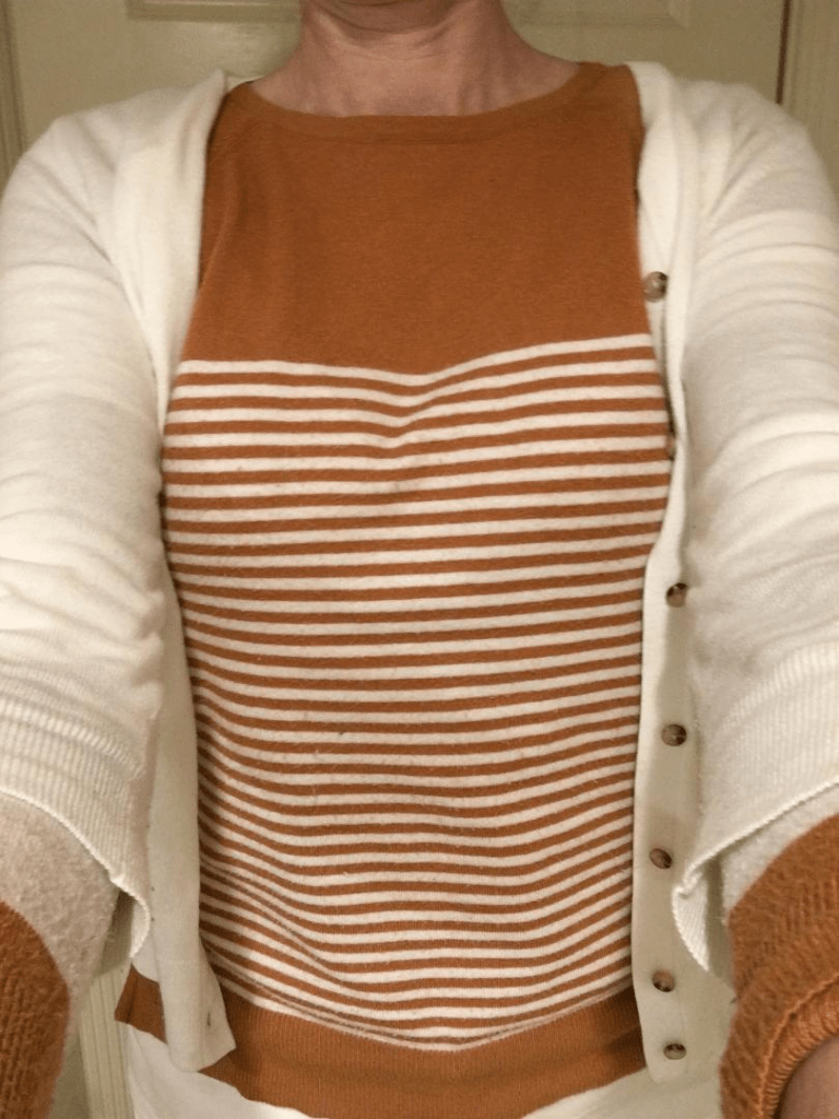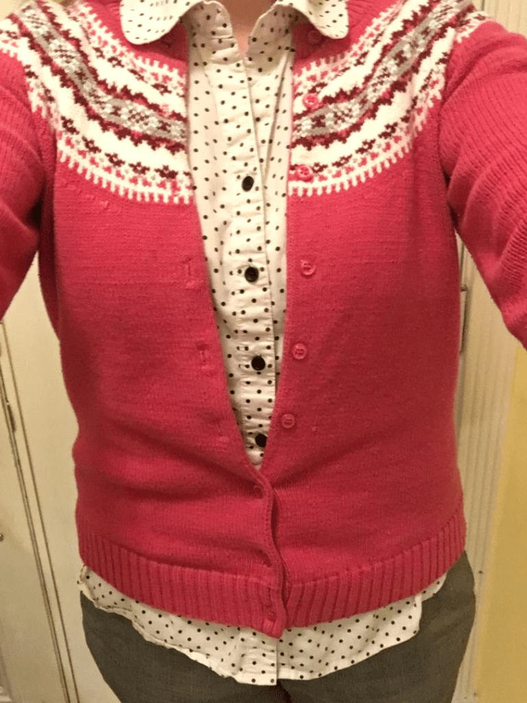 Oh well, I can’t change the past. I guess it was when I learned about hygge (go here to learn about that), about 6 years ago, that I started my “thrifted cardigan sweater artistry” for brightening up winter. It has made my fall, but more especially, my January/winters more exciting. I have a LOT of fun finding sweaters, especially cardigan sweaters, at thrift stores, then coming up with colorful combinations with tops. See all these examples. More will be coming!
