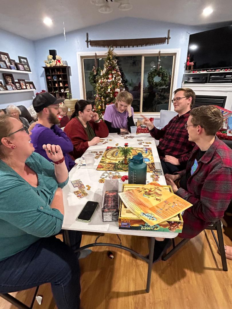 -only committed to one dinner on Christmas Day. We had the fun problem of getting invited to two family dinners on Christmas Day. One for my side, one for my husband’s. In pre-covid days, pre-moving to AZ days, we used to alternate Thanksgiving and Christmas dinners with each side. Then we’d go to the other side for a brief evening visit of dessert before heading home for bedtime. Moving to AZ and back, covid, and my husband’s parents’ deaths have changed all that up. Since moving back to UT from AZ we’ve spent all holiday dinners with my side. Then my sister-in-law (my husband’s sister), who is more like a sister to me than an in-law, moved close by, and she was the first to invite us for dinner. Then a week later my brother’s wife invited us for dinner. These two sisters-in-law happen to live five minutes apart, completely by sheer coincidence. The first dinner was open as to the time. I almost suggested 2 PM with plans to hit the second dinner at 5 but after further reflection I decided that was unwise, as we’d feel rushed and too full of food. So, I just agreed to the one dinner at the first sister-in-law’s and regretfully and graciously declined the other invitation, just saying we’d come for dessert around 7. It all worked out perfectly. I was thrilled to arrive at my brother’s home after our dinner at my sister-in-law’s to find a bunch of my adult nieces and nephews playing Camel Up, a board game I introduced to one of the nephews and his wife last Thanksgiving, when we played it together. They loved it so much they went out and bought it the next day and brought it to play on Christmas.