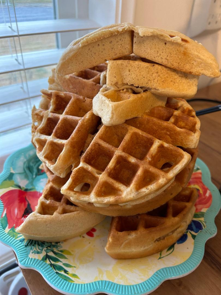 –asked my daughter and son-in-law to help with Christmas Day brunch. I’m so blessed that I have a son-in-law who loves to bake and cook! I’m taking advantage of this whenever I can! He brought ingredients to make waffles and a waffle iron. I resisted eating those and just had my crustless quiche with sausages but others enjoyed the carbs.