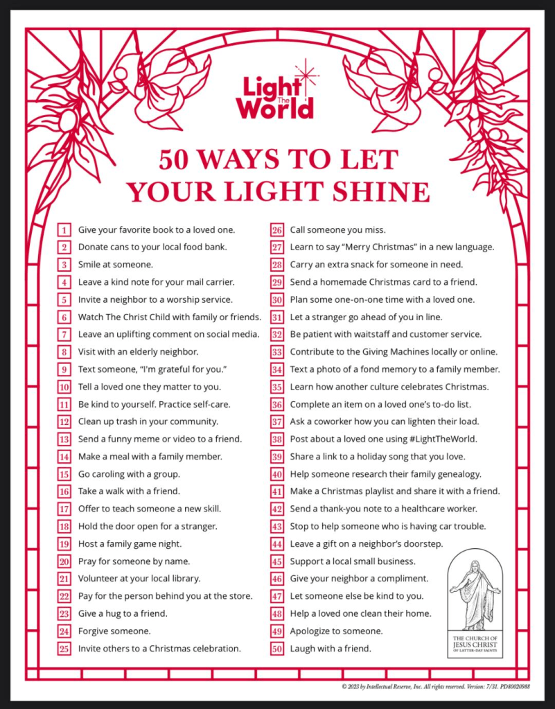 –give a copy of the #LighttheWorld list to everyone in family, encourage them to see how many they can do, and share during dinner conversation and Sparkle Box time. I will text a copy to the out-of-towners.