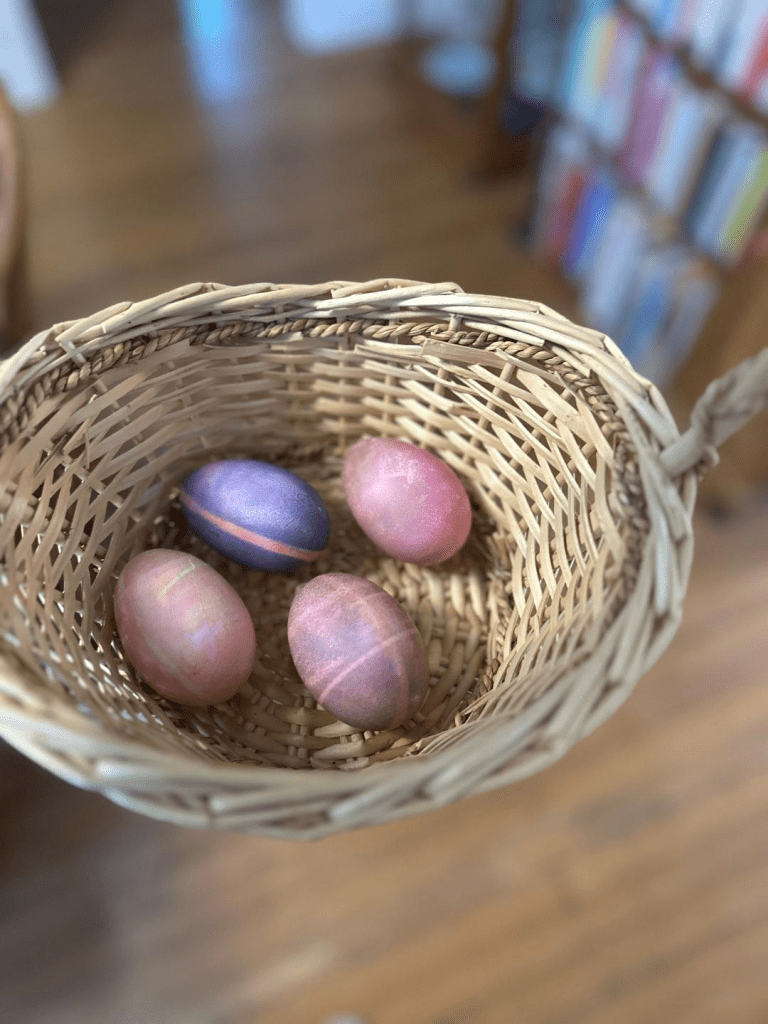 Sadly, the next day, when I went to warm up the eggs by putting them in a bowl with some hot water boiled from the teapot after taking hgem out of the fridge, the hot water washed all the dye away for them all to be uniformly pink. I guess we didn’t use enough vinegar with the dye so it would be colorfast regardless of temperature. So I ended up not getting photos of my art before it washed away! So sad!