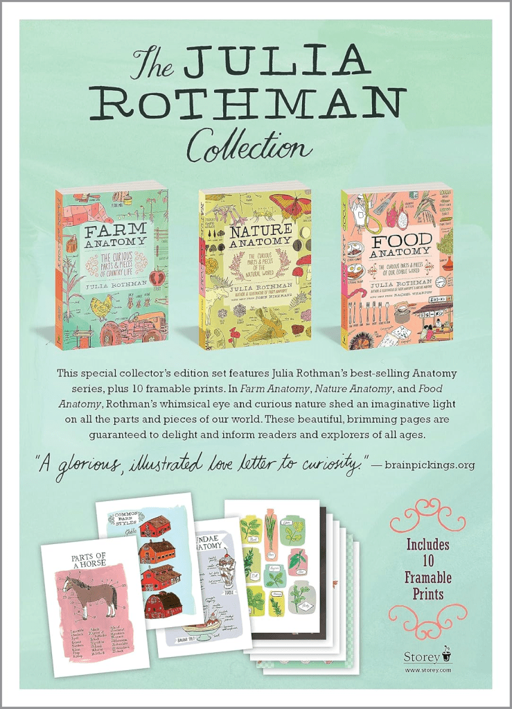 Julia Rothman Collection of Anatomy Books about farm, nature, and food. These are such fun books to look at, for all ages! For all the nature loving and wannabe homestead moms out there. In our increasingly urbanized world, this knowledge is becoming lost! I’m grateful for the author creating these works, inspired by visits to her husband’s family farm. I love to read a few pages a day for our homeschool morning time.
