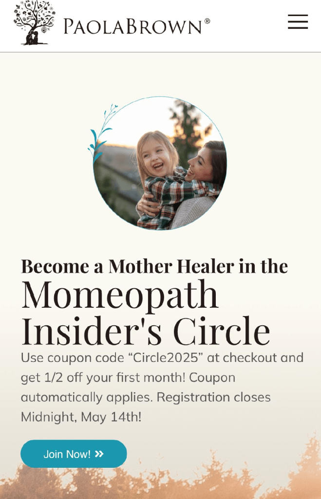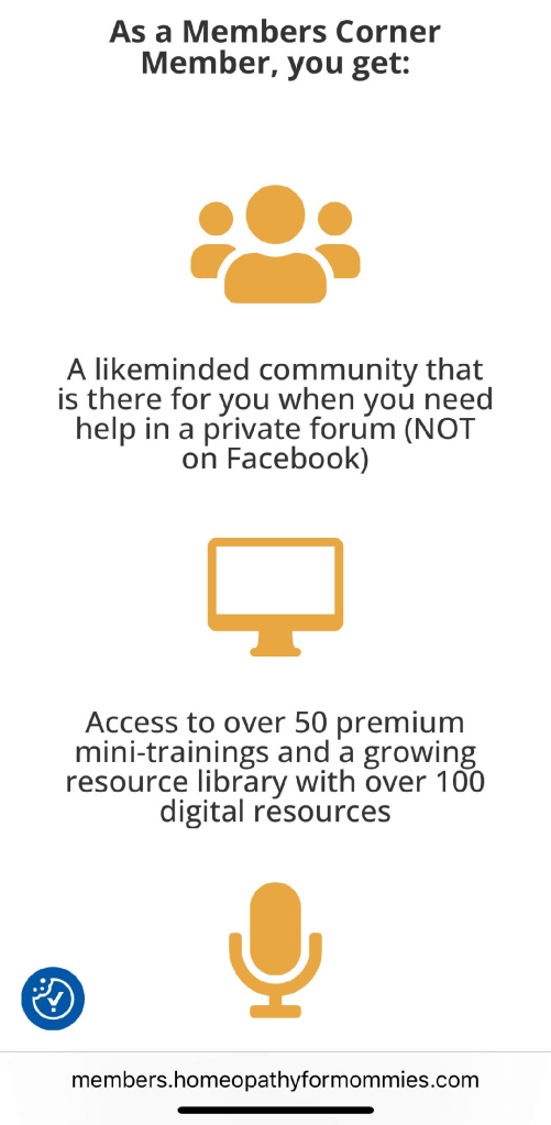 3. Sue Meyer’s Homeopathy for Mommies Members Corner. Sue is a mom of 11, grandmother of 49, and a longtime professional homeopath. She is also a friend of Paola. She started a subscription service/club for moms long before Paola did. Both look wonderful and with different benefits. It’s $34 a month. Go here to get the details.